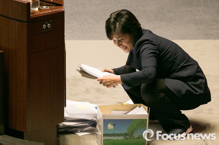 (서울=포커스뉴스) 최민희 더불어민주당 의원이 25일 오전 서울 여의도 국회 본회의장에서 테러방지법 저지를 위한 무제한 토론(필리버스터)을 마친 뒤, 바닥에 놓인 자료를 모으고 있다.