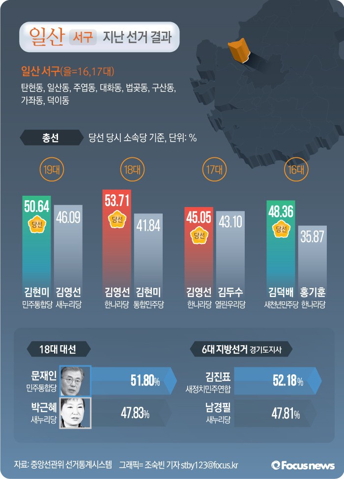 (서울=포커스뉴스) '경기 북부의 정치 1번지'로 불리는 경기 고양시 일산동구와 서구의 지난 선거 결과에서는 여당 후보와 야당 후보가 17, 18, 19대 총선에서 번갈아가며 당선됐다.