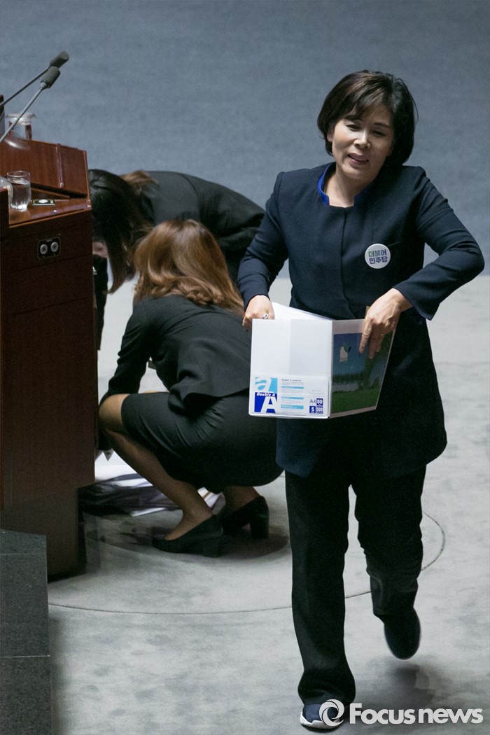 (서울=포커스뉴스) 최민희 더불어민주당 의원이 25일 오전 서울 여의도 국회 본회의장에서 테러방지법 저지를 위한 무제한 토론(필리버스터)을 마친 뒤, 단상을 내려오고 있다.