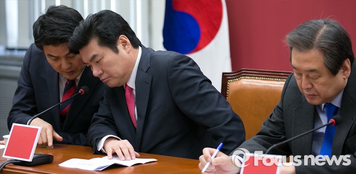 (서울=포커스뉴스) 원유철(가운데) 새누리당 원내대표와 김태호(왼쪽) 최고위원이 25일 오전 서울 여의도 국회에서 열린 최고위원회의에 참석해 대화하고 있다. 오른쪽은 김무성 대표.