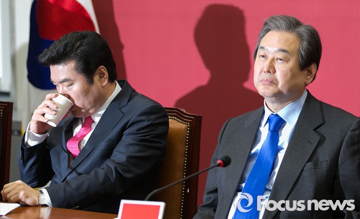 (서울=포커스뉴스) 원유철 새누리당 원내대표가 25일 오전 서울 여의도 국회에서 열린 최고위원회의에 참석해 물을 마시고 있다. 오른쪽은 김무성 대표.