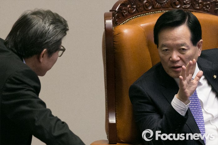 (서울=포커스뉴스) 정의화(오른쪽) 의장과 박형준 사무총장이 25일 오전 서울 여의도 국회 본회의장에서 논의하고 있다.