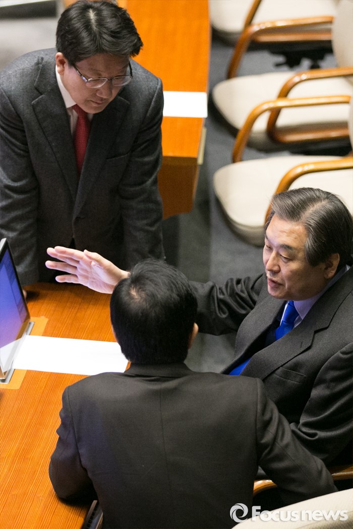 (서울=포커스뉴스) 김무성(오른쪽) 새누리당 대표와 권성동(왼쪽) 전략기획본부장, 김성태 의원이 25일 오전 서울 여의도 국회 본회의장에서 논의하고 있다.