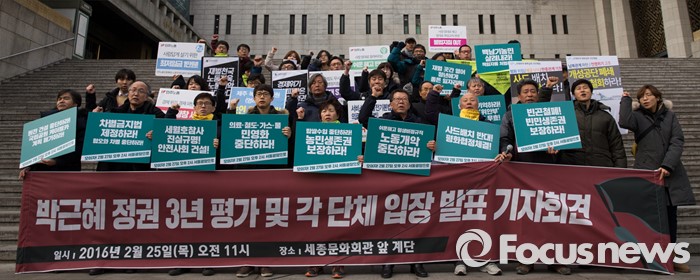 (서울=포커스뉴스) 29일 오전 서울 종로구 세종문화회관 앞에서 열린 '박근혜 정권 3년 평가 기자회견'에 참석한 전국민주노동조합총연맹 등 각 단체 조합원들이 박근혜 정부를 규탄하는 구호를 외치고 있다.