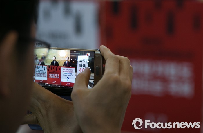 (서울=포커스뉴스) 테러방지법 직권상정에 반발해 야당의 무제한 토론(필리버스터)이 사흘째 진행되고 있는 25일 오전 서울 여의도 국회 본회의장 앞에서 한 당직자가 신의진, 김성태, 권성동 새누리당 의원이 무제한 토론 비판 시위를 하고 있는 모습을 촬영하고 있다.