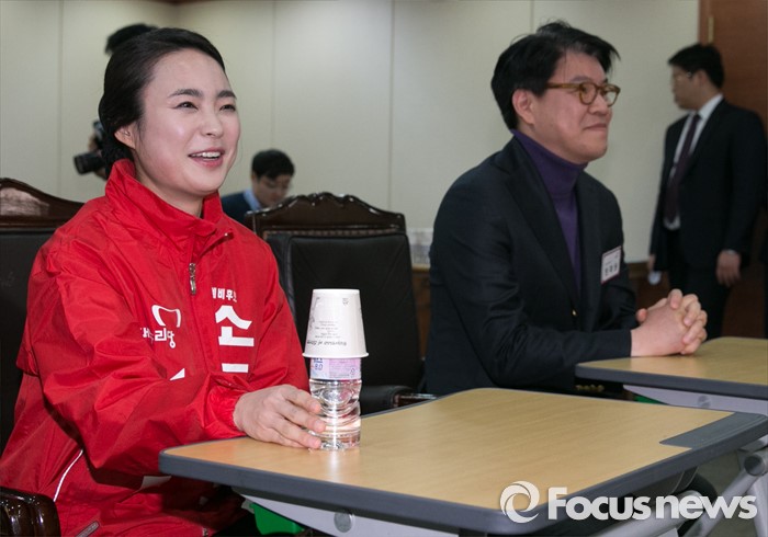 (서울=포커스뉴스) 25일 오전 서울 여의도 새누리당사에서 열린 20대 총선 공천 신청자 면접심사에 참석한 손수조(왼쪽), 장제원 부산 사상구 예비후보가 공관위원들의 질문에 답하고 있다.