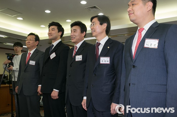 (서울=포커스뉴스) 25일 오전 서울 여의도 새누리당사에서 열린 20대 총선 공천 신청자 면접심사에 부산 사하을에 신청한 조경태 새누리당 의원과 예비후보들이 취재진을 향해 포즈를 취하고 있다. 왼쪽부터 석동현, 배관구, 이호열, 조경태, 이용원 예비후보.