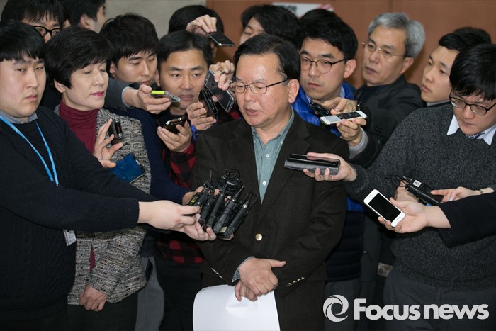 (서울=포커스뉴스) 김부겸 더불어민주당 대구 수성갑 예비후보가 25일 오후 서울 여의도 국회 정론관에서 컷오프에 반발해 탈당한 홍의락 의원에 대한 공천 배제 조치 취소를 요구하는 기자회견을 마친 뒤 취재진 질문에 답하고 있다. 홍 의원은 대구 북구을에 출마를 준비해왔다.
