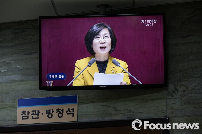 | △ 모니터에 비친 필리버스터 7번째 주자, 정의당 김제남 의원 |
