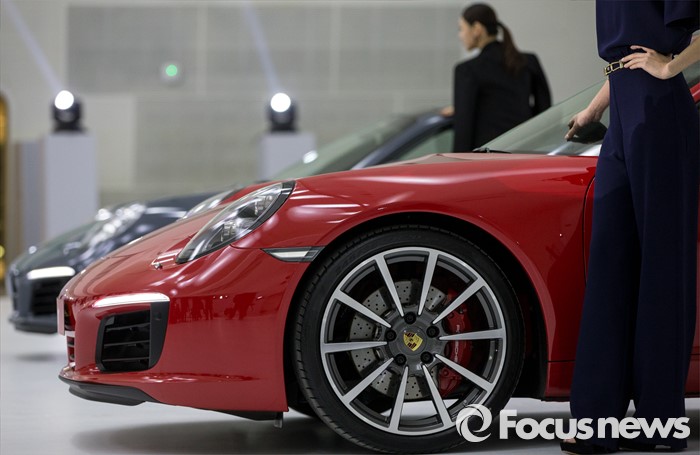 (서울=포커스뉴스) 25일 오전 서울 중구 동대문디지털플라자에서 모델들이 포르쉐 신형 911 카레라S(앞)와 911 카레라를 선보이고 있다.