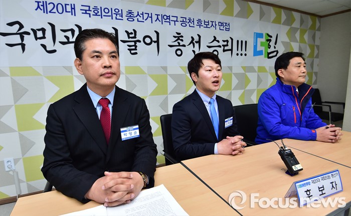 (서울=포커스뉴스) 25일 오전 서울 여의도 더불어민주당사에서 열린 20대 총선 공천 신청자 면접심사에 참석한 박영순(왼쪽부터), 고재일, 정현태 대전 대덕 예비후보가 홍창선 공천관리위원장 질의에 답하고 있다.