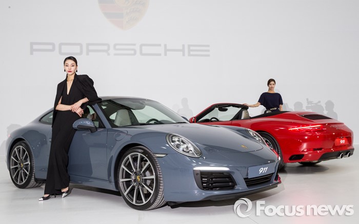 (서울=포커스뉴스) 25일 오전 서울 중구 동대문디지털플라자에서 모델들이 포르쉐 신형 911 카레라(왼쪽)와 911 카레라S를 선보이고 있다.