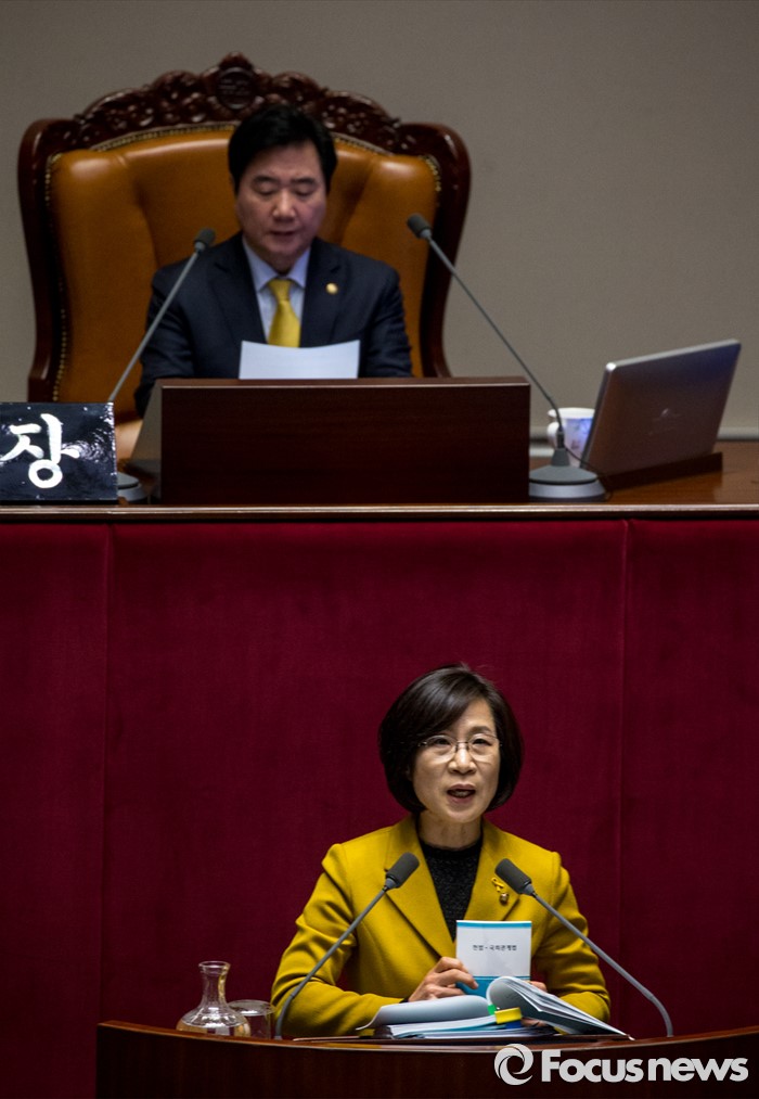 (서울=포커스뉴스) 테러방지법 직권상정에 반발해 야당의 무제한 토론(필리버스터)이 사흘째 진행되고 있는 25일 오후 서울 영등포구 국회 본회의장에서 김제남 정의당 의원이 헌법-국회관계법 책을 든 채 발언을 이어가고 있다.