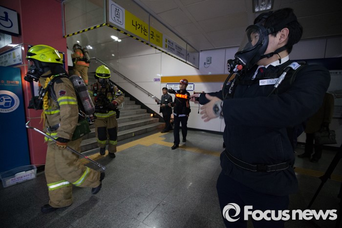 (서울=포커스뉴스) 25일 오후 서울 마포구 월드컵경기장역에서 실시한 지하철 대형사고 대응 불시 현장훈련에서 지하철 직원이 역사 내에 대피를 유도하고 있다.