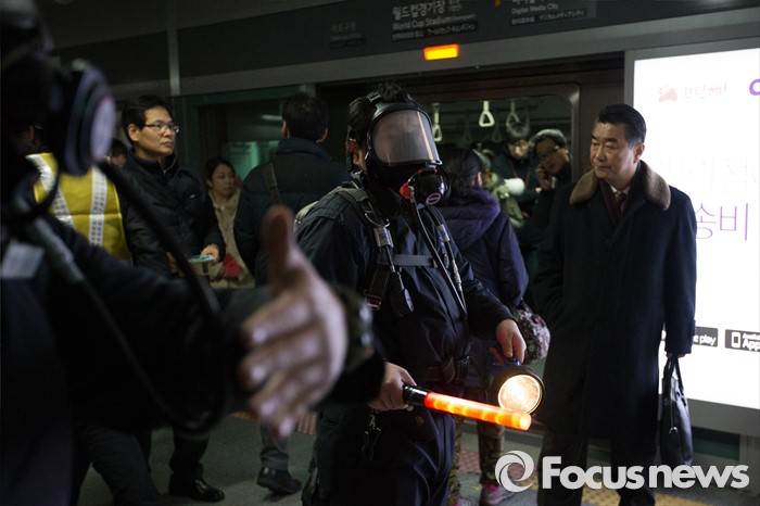 (서울=포커스뉴스) 25일 오후 서울 마포구 월드컵경기장역에서 실시한 지하철 대형사고 대응 불시 현장훈련에서 관계자들이 역사 내에 대피를 유도하고 있다.