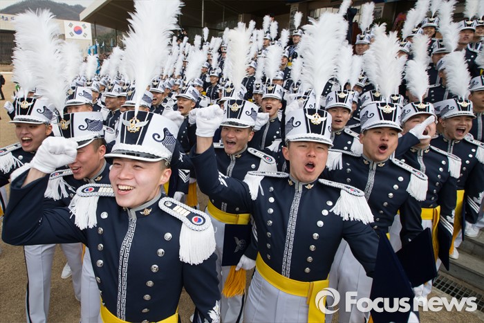 (청주=포커스뉴스) 25일 오후 충북 청주시 공군사관학교 연병장에서 열린 제64기 공군사관학교 졸업식에서 졸업생도들이 후배생도들의 분열을 바라보며 환호하고 있다.