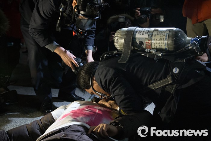 (서울=포커스뉴스) 25일 오후 서울 마포구 월드컵경기장역에서 실시한 지하철 대형사고 대응 불시 현장훈련에서 소방관이 구조활동을 하고 있다.