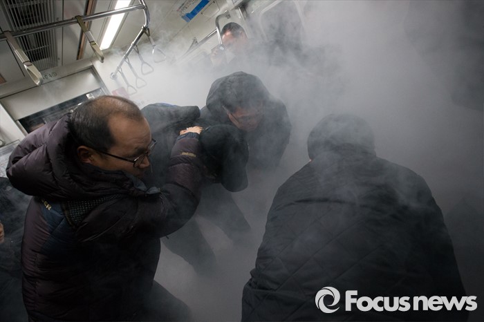 (서울=포커스뉴스) 25일 오후 서울 마포구 월드컵경기장역에서 실시한 지하철 대형사고 대응 불시 현장훈련에서 시민들이 방화범역을 받은 시민을 제지하고 있다.