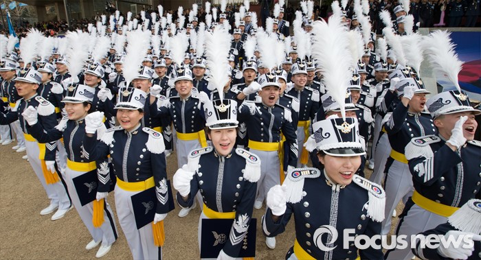 (청주=포커스뉴스) 25일 오후 충북 청주시 공군사관학교 연병장에서 열린 제64기 공군사관학교 졸업식에서 졸업생도들이 후배생도들의 분열을 바라보며 환호하고 있다.