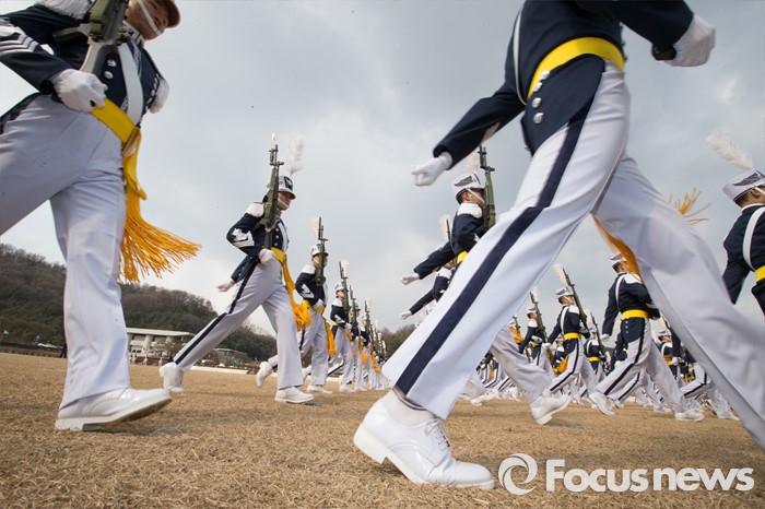 (청주=포커스뉴스) 25일 오후 충북 청주시 공군사관학교 연병장에서 열린 제64기 공군사관학교 졸업식에서 후배생도들이 분열하고 있다.