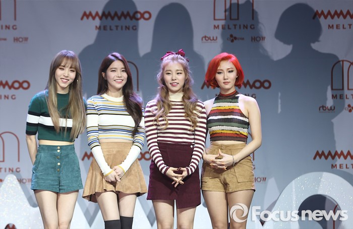 (서울=포커스뉴스) 25일 오후 서울 마포구 예스24 무브홀에서 열린 걸그룹 마마무의 정규 1집 'Melting' 쇼케이스에 참석한 멤버들이 신곡무대를 선보이고 있다. 왼쪽부터 멤버 문별, 솔라, 휘인, 화사.