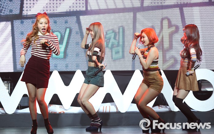 (서울=포커스뉴스) 25일 오후 서울 마포구 예스24 무브홀에서 열린 걸그룹 마마무의 정규 1집 'Melting' 쇼케이스에 참석한 멤버들이 신곡무대를 선보이고 있다. 왼쪽부터 멤버 휘인, 문별, 화사, 솔라