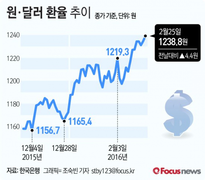(서울=포커스뉴스) 25일 서울 외환시장에서 원·달러 환율은 전 거래일 대비 4.4원 상승(원화 가치 하락)한 1238.8원에 마감했다. 이는 지난 2010년 6월 11일 1246.1원(종가) 이후 최고치다.