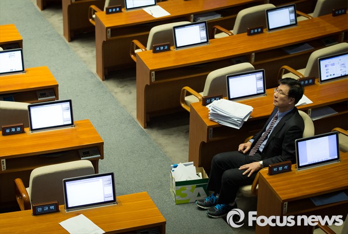 (서울=포커스뉴스) 테러방지법 직권상정에 반발해 야당의 무제한 필리버스터(무제한 토론)가 사흘째 진행되고 있는 25일 오후 서울 여의도 국회 본회의장에서 신경민 더불어민주당 의원이 토론에 앞서 깊은 생각에 잠겨 있다.