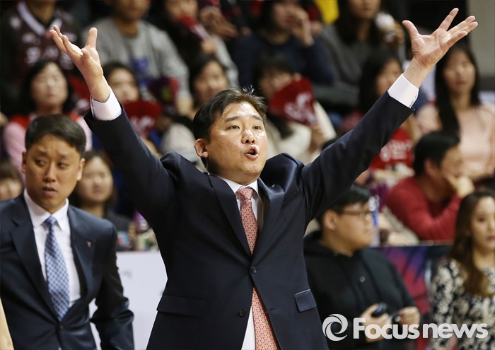 (안양=포커스뉴스) 25일 안양실내체육관에서 열린 2015-2016 프로농구 6강 플레이오프 KGC-삼성 1차전에서 KGC 김승기 감독이 선수들에게 경기중 작전 사인을 보내고 있다.