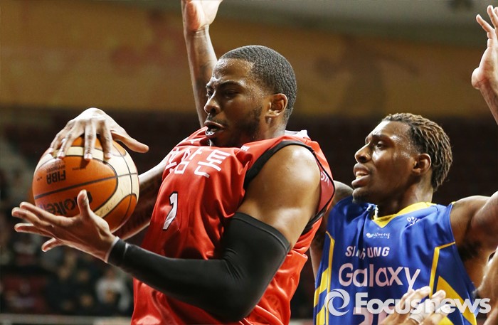 (안양=포커스뉴스) 25일 안양실내체육관에서 열린 2015-2016 프로농구 6강 플레이오프 KGC-삼성 1차전에서 KGC 찰스 로드가 삼성 라틀리프에 앞서 리바운드 볼을 잡고 있다.