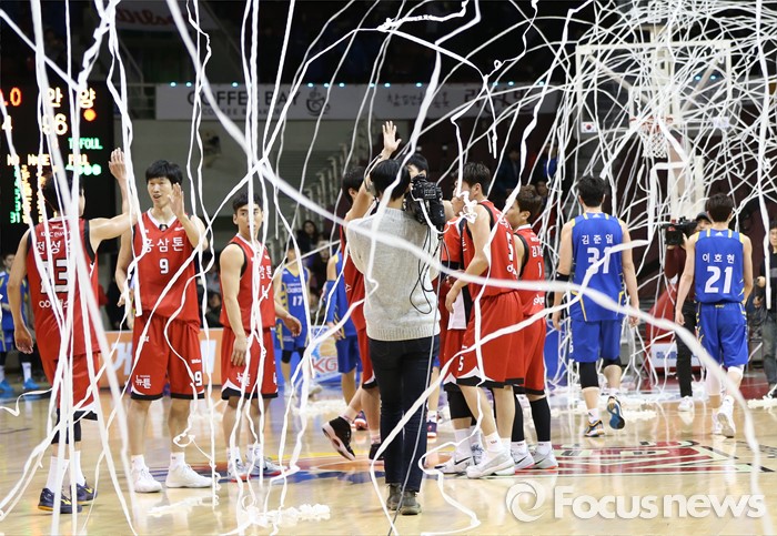 (안양=포커스뉴스) 25일 안양실내체육관에서 열린 2015-2016 프로농구 6강 플레이오프 1차전에서 삼성을 물리친 KGC 선수들이 플로어에서 하이파이브를하며 기뻐하고 있다.
