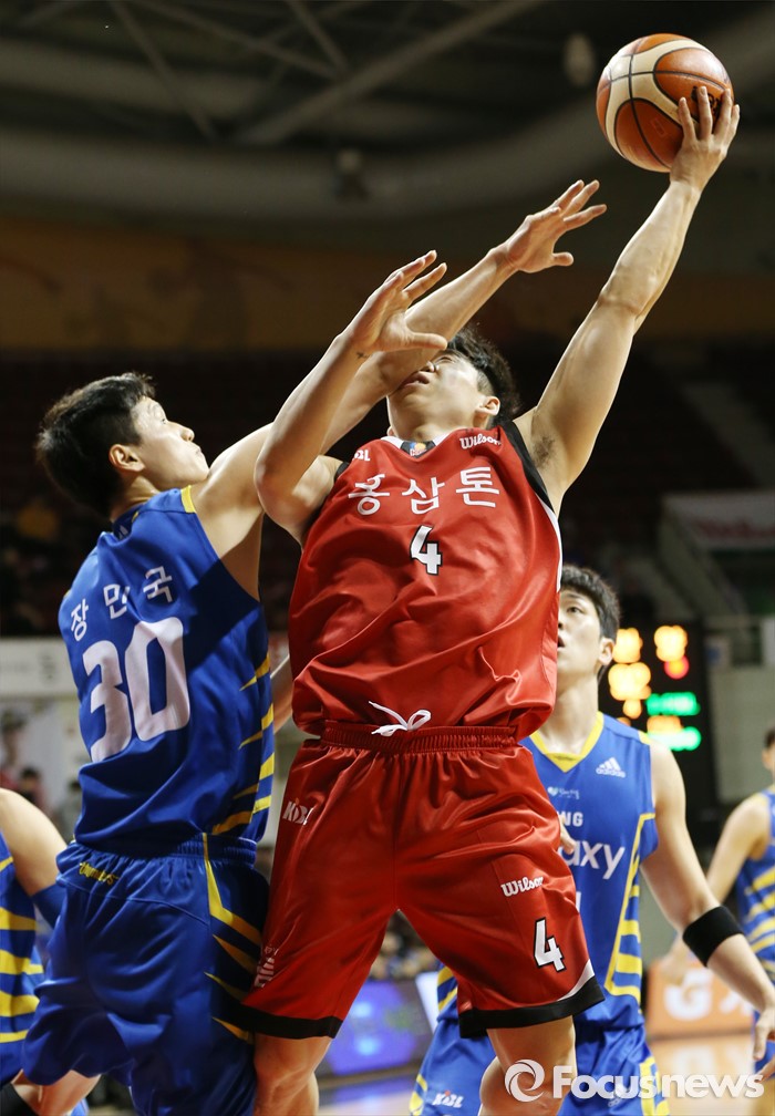 (안양=포커스뉴스) 25일 안양실내체육관에서 열린 2015-2016 프로농구 6강 플레이오프 KGC-삼성 1차전에서 KGC 김윤태가 삼성 장민국의 수비를 제치며 레이업슛을 시도하고 있다.