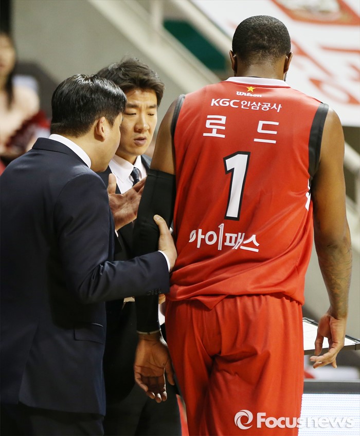 (안양=포커스뉴스) 25일 안양실내체육관에서 열린 2015-2016 프로농구 6강 플레이오프 KGC-삼성 1차전에서 KGC 김승기 감독이 찰스 로드를 불러 작전을 주문하고 있다.