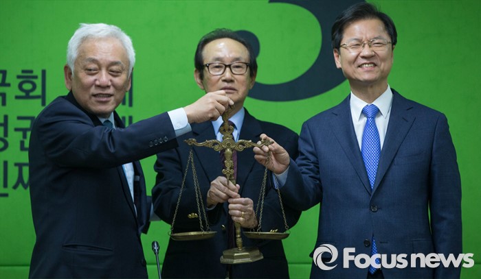(서울=포커스뉴스) 25일 오후 서울 마포구 국민의당 당사에서 열린 제1차 공직선거후보자추천관리위원회에서 김한길(왼쪽) 의원과 전윤철(중앙) 국민의당 공천관리 위원장, 천정배(오른쪽) 공동대표가엄정한 기준으로 적용되는 공천을 바란다는 의미를 담은 천칭저울을 들고 있다.