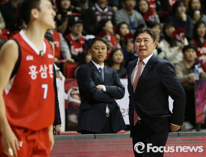 (안양=포커스뉴스) 25일 안양실내체육관에서 열린 2015-2016 프로농구 6강 플레이오프 KGC-삼성 1차전에서 KGC 김승기 감독이 삼성에게 3점슛을 허용하자 아쉬워하고 있다.