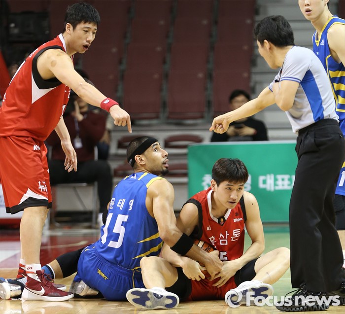 (안양=포커스뉴스) 25일 안양실내체육관에서 열린 2015-2016 프로농구 6강 플레이오프 KGC-삼성 1차전에서 KGC 양희종과 심판이 문성곤과 볼다툼을 하던 삼성 문태영의 파울을 지적하고 있다.