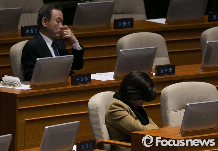 (서울=포커스뉴스) 테러방지법 직권상정에 반발해 야당의 무제한 토론(필리버스터)이 나흘째 진행되고 있는 26일 오전 서울 여의도 국회 본회의장에서 일부 자리한 새누리당 의원들이 졸고 있다.