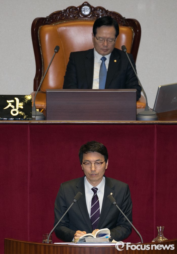 (서울=포커스뉴스) 테러방지법 직권상정에 반발해 야당의 무제한 토론(필리버스터)이 나흘째 진행되고 있는 26일 오전 서울 여의도 국회 본회의장에서 토론에 참여한 서기호 정의당 의원이 발언하고 있다.