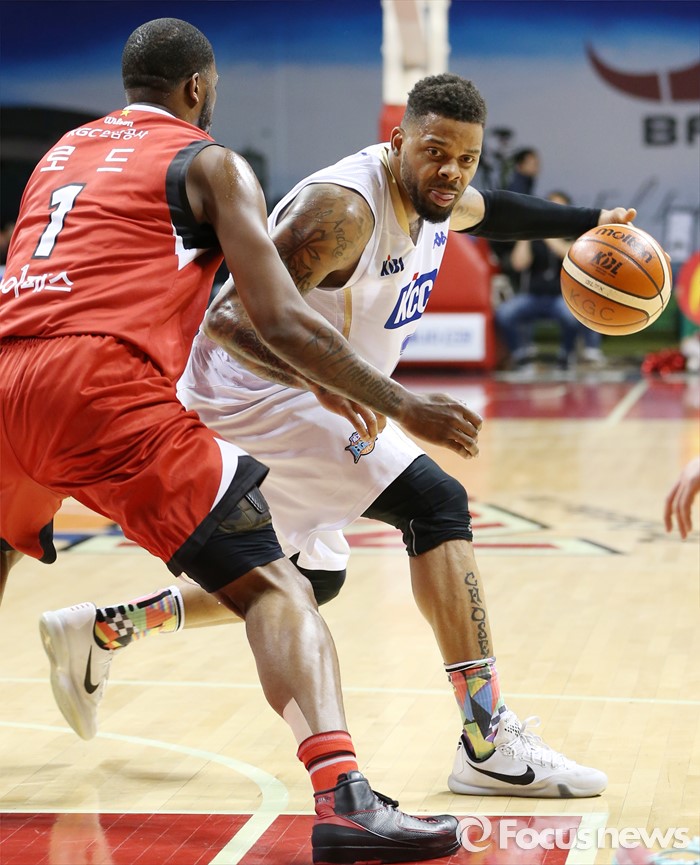 KCC는 6라운드 MVP 투표 1위와 2위를 차지한 에밋과 하승진, 전태풍의 활약 속에 팀 최초이자 역대 6번째 라운드 전승을 달성했다. 연승 행진으로 정규리그 우승 기쁨도 맛봤다.(안양=포커스뉴스) 21일 안양실내체육관에서 열린 2015-2016 프로농구 KGC-KCC 경기에서 KCC 안드레 에밋이 KGC 찰스 로드의 마크를 받으며 골밑 돌파를 노리고 있다. 2016.02.21 우정식 기자