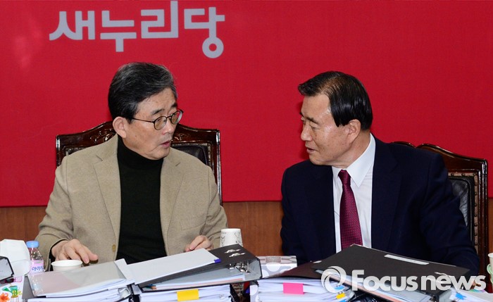 (서울=포커스뉴스) 26일 오전 서울 여의도 새누리당사에서 열린 20대 총선 공천 신청자 면접심사에 참석한 이한구(왼쪽) 공천관리위원장과 홍문표 위원이 대화하고 있다.