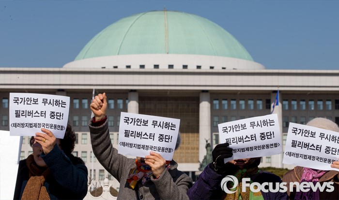 (서울=포커스뉴스) 26일 오전 서울 여의도 국회 정문 앞에서 보수단체 회원들이 테러방지법 제정을 요구하는 구호를 외치고 있다.