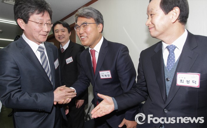 (서울=포커스뉴스) 26일 오전 서울 여의도 새누리당사에서 열린 20대 총선 공천 신청자 면접심사에 참석한 유승민(왼쪽부터), 이재만, 최성덕 대구 동구을 예비후보가 악수하고 있다.
