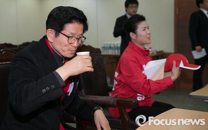 (서울=포커스뉴스) 26일 오후 서울 여의도 새누리당사에서 열린 20대 총선 공천 신청자 면접심사에 참석한 김문수 대구 수성갑 예비후보가 물을 마시고 있다. 오른쪽은 안영희 예비후보.
