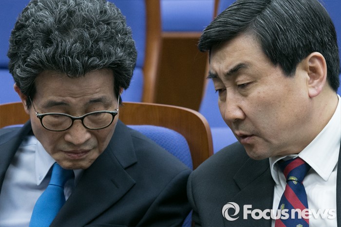 (서울=포커스뉴스) 이종걸(오른쪽) 더불어민주당 원내대표와 이목희 정책위의장이 26일 오후 서울 여의도 국회에서 열린 의원총회에 참석해 대화하고 있다.