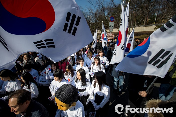 (서울=포커스뉴스) 3.1절을 나흘 앞둔 26일 오후 서울 용산구 효창공원 앞에서 열린 '나라사랑 태극기 만세 행진'에 참가한 주민들이 태극기를 흔들며 행진 하고 있다.