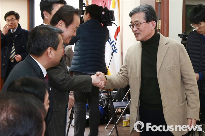 (서울=포커스뉴스) 26일 오후 서울 여의도 새누리당사에서 열린 20대 총선 공천 신청자 면접심사에 참석한 이한구 공천관리위원장이 회의실에 들어서며 대기 중인 예비후보들과 인사하고 있다.