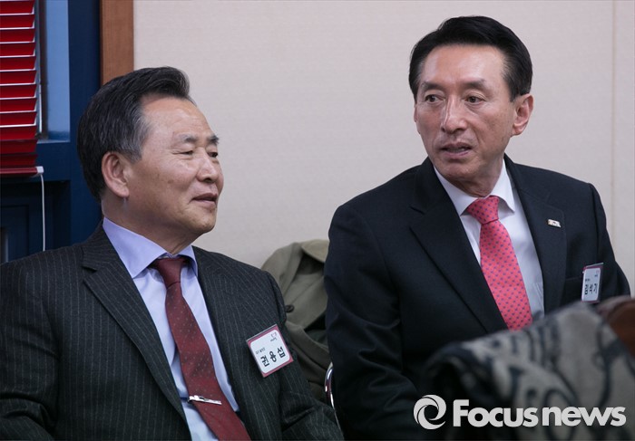(서울=포커스뉴스) 26일 오후 서울 여의도 새누리당사에서 열린 20대 총선 공천 신청자 면접심사에 참석한 김석기(오른쪽) 경북 경주 예비후보와 권용섭 대구 달성군 예비후보가 면접을 기다리며 대화하고 있다.