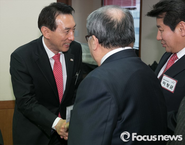 (서울=포커스뉴스) 26일 오후 서울 여의도 새누리당사에서 열린 20대 총선 공천 신청자 면접심사에 참석한 김석기(왼쪽) 경북 경주 예비후보가 다른 예비후보들과 인사하고 있다.