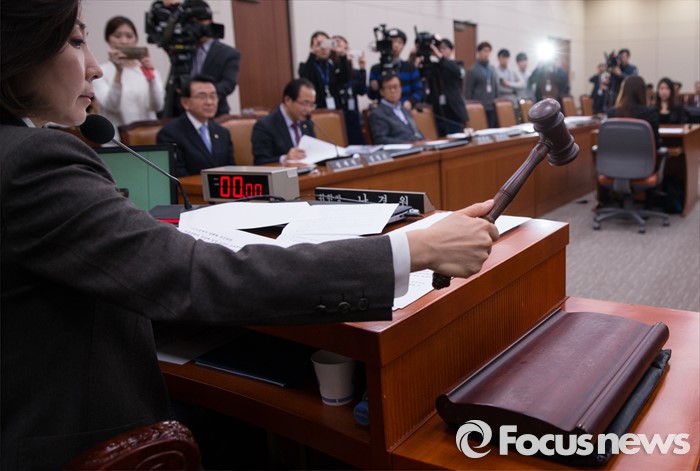 (서울=포커스뉴스) 나경원 외통위원장이 26일 오후 서울 여의도 국회 외교통일위원회 전체회의에서 박근혜정부의 국정 핵심 법안 중 하나인 북한인권법을 의결하며 의사봉을 두드리고 있다.