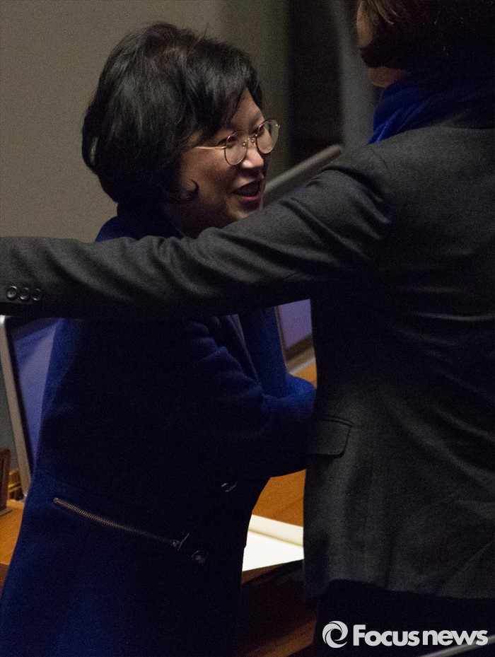 (서울=포커스뉴스) 테러방지법 직권상정에 반발해 야당이 무제한 토론(필리버스터)를 나흘째 진행하고 있는 26일 오후 서울 여의도 국회 본회의장에서 김현(왼쪽) 더불어민주당 의원이 토론을 마친 뒤 한정애 의원과 포옹하고 있다.